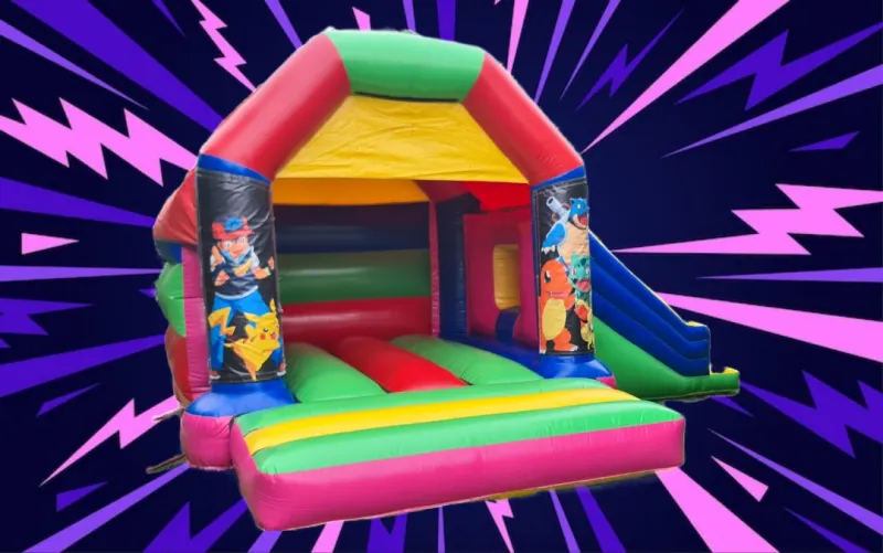 This vibrant and colorful Pokémon-themed bouncy castle is perfect for young fans and guaranteed to bring excitement to any event. Featuring bright red, green, yellow, blue, and pink inflatable panels, it offers a spacious bounce area and a fun slide on the side. The front pillars are decorated with popular Pokémon characters like Pikachu, Charmander, Squirtle, Blastoise, and a trainer resembling Ash Ketchum, making it an eye-catching centerpiece for birthdays, school events, and parties.